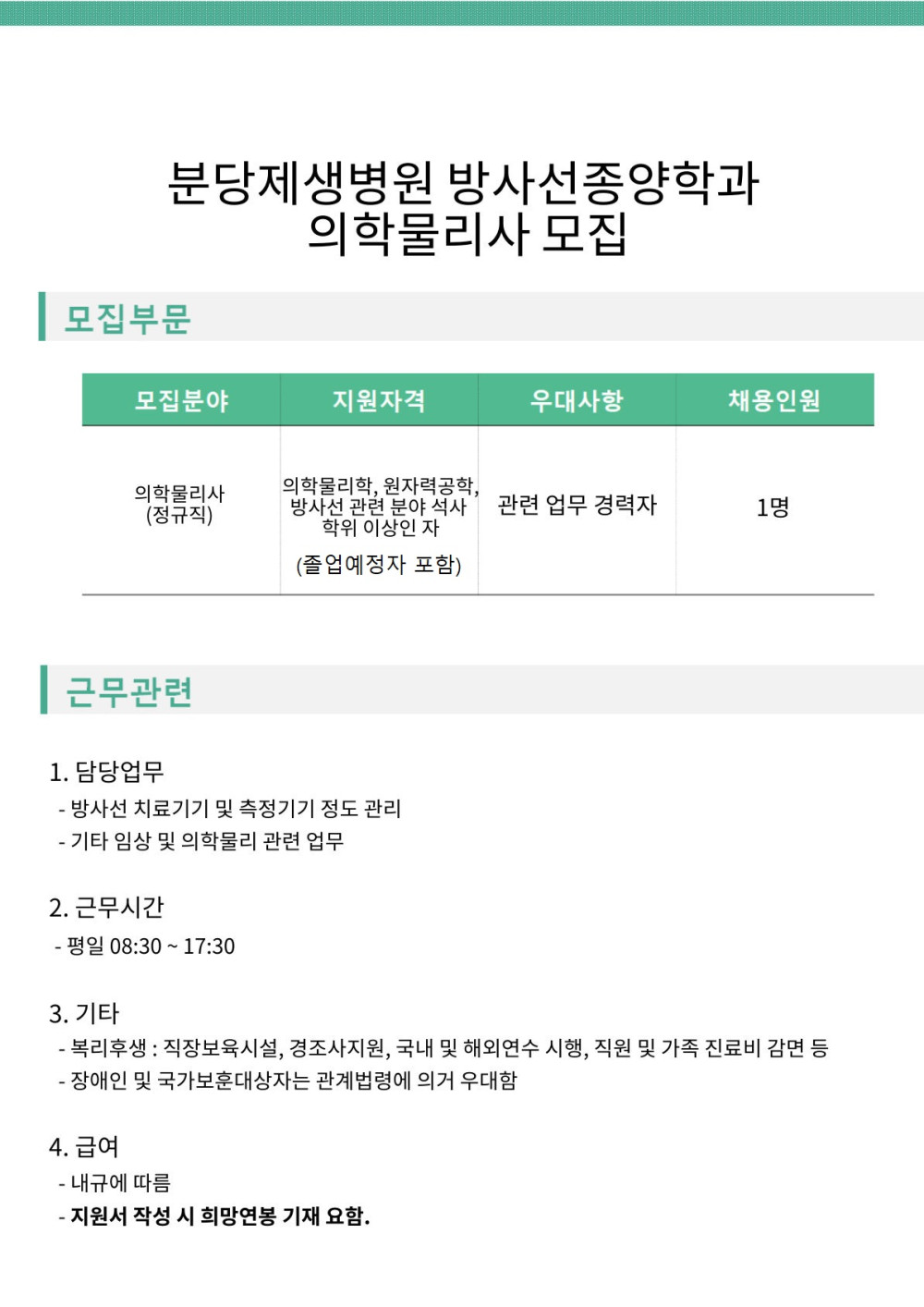 일반게시물 분당제생병원 방사선종양학과 의학물리사 채용공고 페이지 정보 작성자양정모 댓글0 조회111 작성일25.10.16 11:39 관련링크 https://www.dmc.or.kr/recruit/recruit/view.do?no=20223834 58회 연결 본문 분당제생병원 방사선종양학과에서 의학물리사를 모집합니다. 다음글분당제생병원 방사선종양학과 의학물리사 채용공고 25.09.15 Comment 0 댓글목록 등록된 댓글이 없습니다.