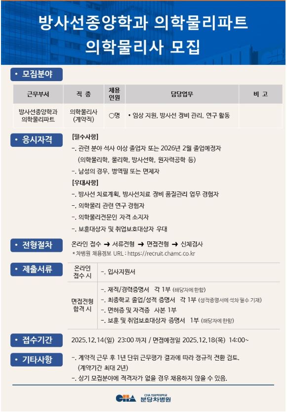 - 다음글분당차병원 방사선종양학과 의학물리사 채용공고 25.11.05