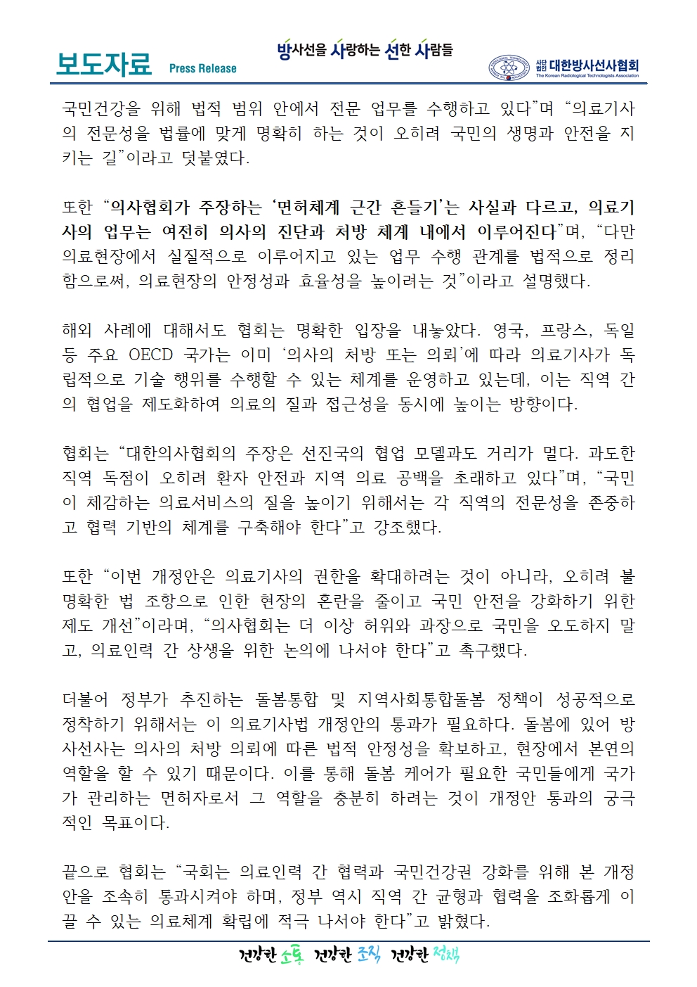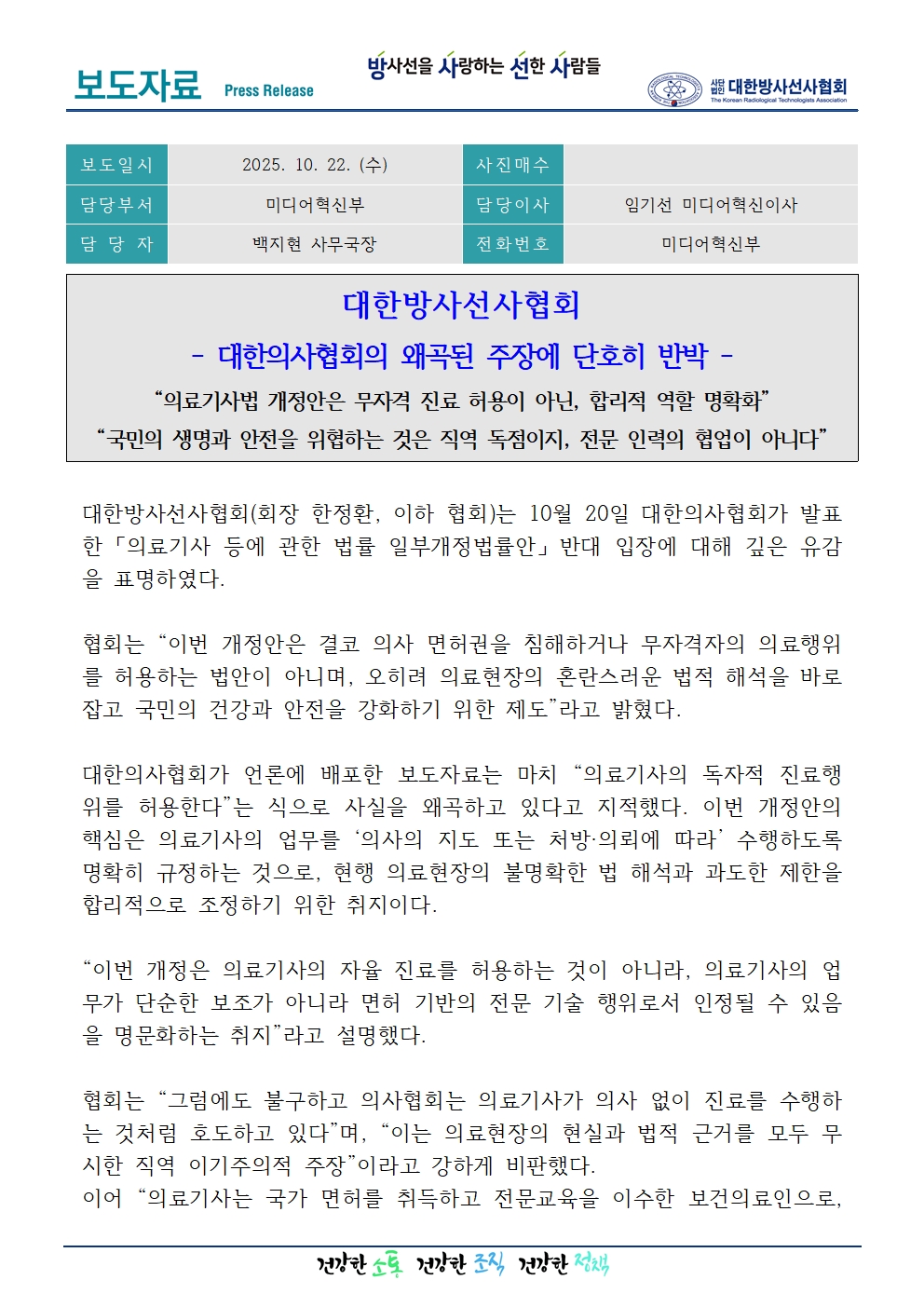 [대한방사선사협회] "의료기사법 개정안은 무자격 진료 허용이 아닌, 합리적 역할 명확화" 대한의사협회의 왜곡된 주장에 단호히 반박 페이지 정보 작성자관리자12 댓글0 조회52 작성일25.10.22 12:27 본문 Comment 0 댓글목록 등록된 댓글이 없습니다.
